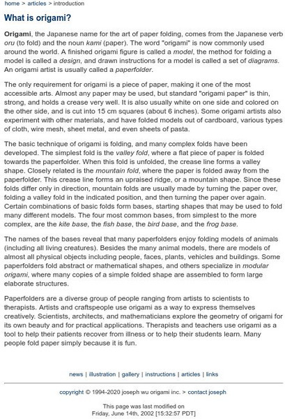 A brief history of the art of Origami by Joseph Wu. Basic techniques, types of paper, and terminology are discussed.