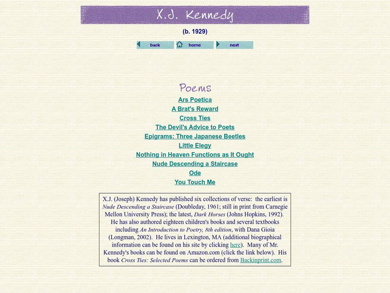 The Poem Tree, an anthology of metered poetry, provides a brief biographical note about Kennedy, and links to the text of some of his works.