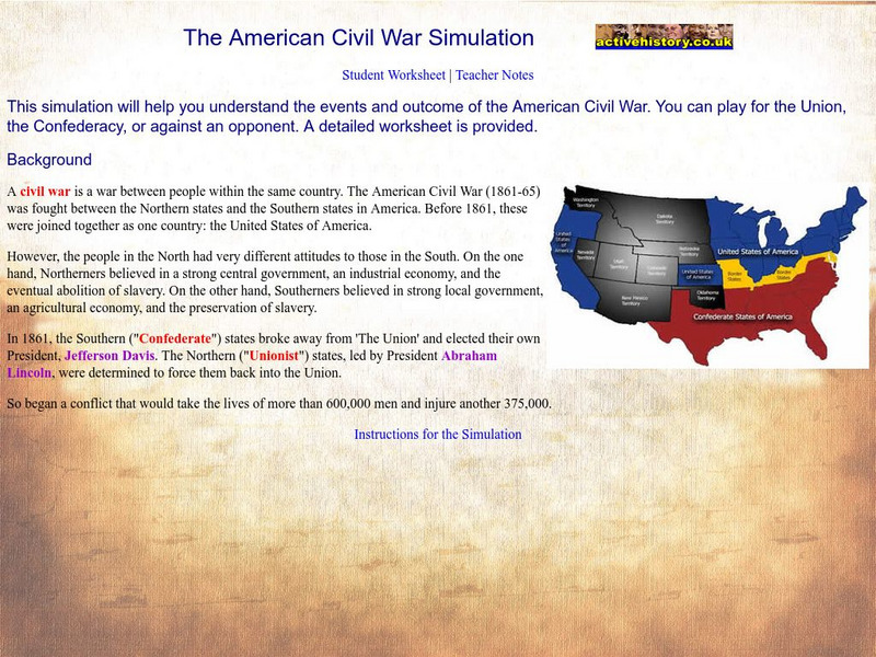 Take on the role of President Jefferson Davis or President Abraham Lincoln and proceed through the Civil War. This simulation can be played between two players or one. Users are challenged to choose the courses that each president likely...