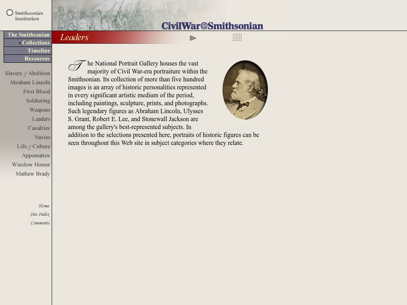 This site has photographs and paintings of Civil War leaders, both political and military. Clicking on the arrow will take you through pictures and brief biographies of the leaders. From the National Portrait Gallery.