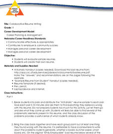 A resume is a key requirement in the job application process. As part of a career unit study for high school freshmen, pairs critique a bad resume, brainstorm as a whole class what should be included in a resume, and then as individuals,...
