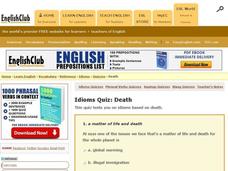 For this idioms quiz worksheet, students read the example idioms about death used in the sentences. Students select the best answer to complete the 10 online exercises.