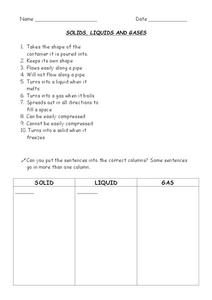 In this chemistry element learning exercise, 7th graders complete three pages of activities that help them learn about solid, liquid, and gas forms.