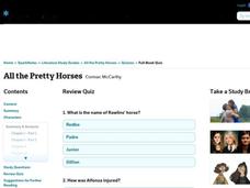 For this online interactive reading comprehension worksheet, students respond to 25 multiple choice questions about Cormac McCarthy's All the Pretty Horses. Students may submit their answers to be scored.