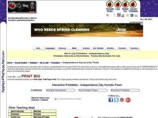 In this online interactive language arts worksheet, students write an acrostic poem regarding the 4th of July using the letters INDEPENDENCE. This worksheet may also be printed for use in classrooms.