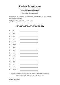 In this language arts instructional activity, students examine 15 words in a word bank. Students write a word that is a homophone, or word that sounds the same but is spelled differently.