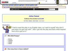 Determine how well your class understood Shakespeare's Julius Caesar with this quiz. This resource lists fifteen multiple choice questions. The questions are based solely on plot, and, since anyone can create a Fun Trivia Quiz, you might...