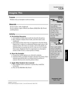 Students write descriptive words about colorful pictures and then write about a character. In this writing lesson plan, students have a character worksheet to fill out.