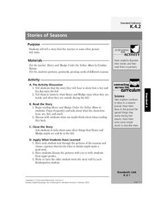 Students listen to the story "Henry and Mudge Under The Yellow Moon," and write their own story based on a season. In this writing lesson plan, kindergarteners are assisted in "writing" their story by an older student or the teacher....
