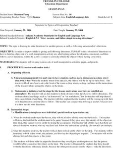 First graders view the object on their desk observing the colors, patterns, and the way the object is put together but not touching it. They then write on paper the directions they would give someone so that they would be able to build...