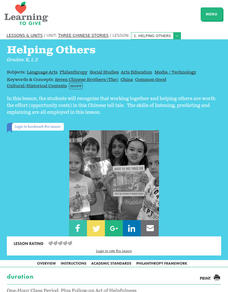 Students listen to The Seven Chinese Brothers and identify tall tale elements in it. They brainstorm ways they could help each other in school. They create a banner reflecting the style and art of Chinese decorations and clothing in the...