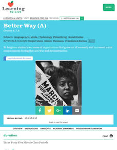 Students increase awareness of organizations that grew out of necessity and increased social consciousness during the Civil War and Reconstruction. They trace the origins of three organizations founded for the common good. They link...