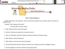In this grammar worksheet, students choose the appropriate pronoun, who or whom, that makes ten sentences grammatically correct.