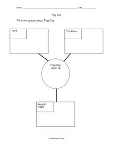 In this national day holiday activity, students fill in 3 boxes with important information about Flag Day. Students include the year 1777, traditions and the events that happened in August 1949.
