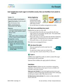 Students compare sugar levels in cereals. In this nutrition lesson, students learn how to read a nutrition facts label, predict which products will have the most sugar, discover which cereals contain the most sugar and discuss...