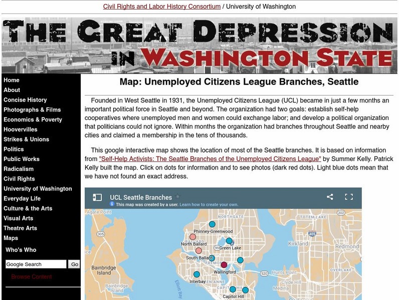 The Unemployed Citizens League (UCL) was formed in Washington as a political organization for the unemployed that the government could not ignore. This google map shows the addresses for the branches of the UCL in Washington.