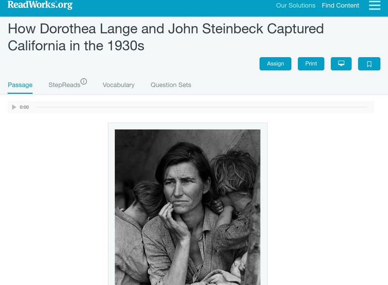 [Free Registration/Login Required] An informational text about how photographer Dorothea Lange and author John Steinbeck portrayed life in California in the late 1930's. A question sheet is available to help students build skills in...