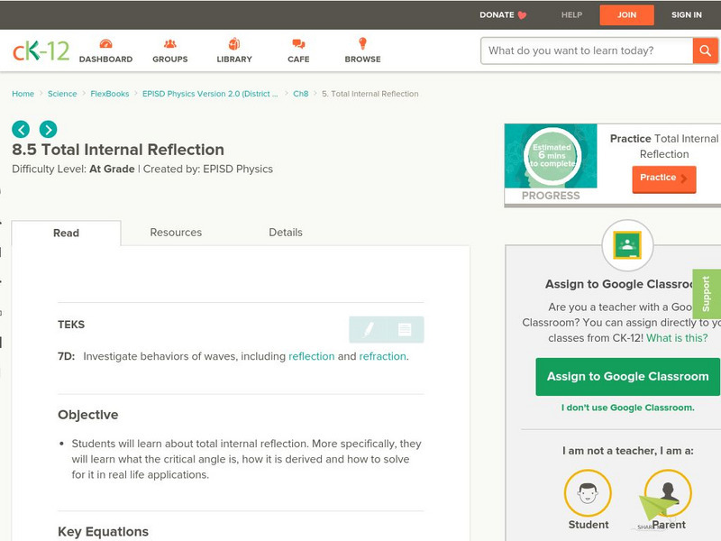 [Free Registration/Login may be required to access all resource tools.] Students learn about total internal reflection. More specifically, they will learn what the critical angle is, how it is derived and how to solve for it in real life...