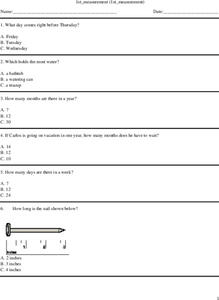 In this first grade measurement worksheet, 1st graders answer 15 multiple choice questions that include days of the week, months, inches, feet, and liquid measurement.