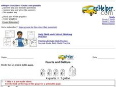 In this worksheet about liquid measurement, students compare quarts and gallons. Students learn that four quarts equals one gallon. Students then look at eight different problems where there determine if the quarts shown represent a...