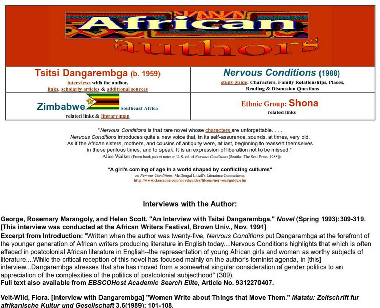 This resource has interviews with Dangarembga and links to other sites. It offers a study guide for "Nervous Conditions." A good site to check out on the subject.