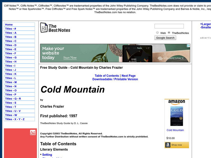 This is an online study guide/notes for the novel Cold Mountain by Charles Frazier including author information, literary elements, chapter-by-chapter summaries/notes, study questions, and analysis.