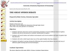 Students study about the survival and hunting strategies of several different kinds of spiders. They also be introduced to scientific classification of spiders and write a brief report about one of the spider families they observe.