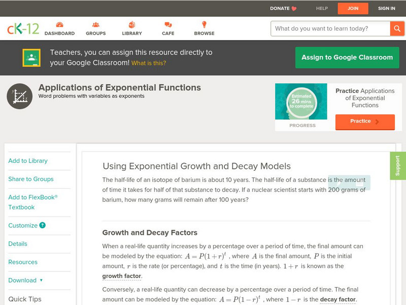 [Free Registration/Login may be required to access all resource tools.] This lesson covers how to use exponential functions in real-life situations. Students watch a video tutorial, explore guided notes and attempt practice problems.