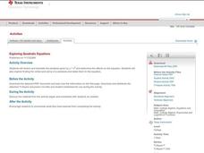 By stretching and translating the parabola given and determining the effects on the equation, young scholars explore finding the vertex and zeros of a parabola and relate them to the equation. Students also view the intercept form to...