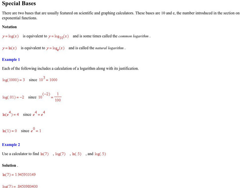 The tutorial examines base 10 and base e. Students learn about the mathematics concepts through examples with detailed solutions.