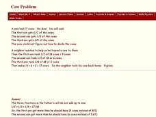 In this cow problem activity, students add fractional numbers. They explore a word problem requiring addition of fractions and logic. This one-page activity contains 1 problem. The answer is provided at the bottom of...