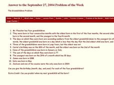 In this grandchildren problem, students read facts about grandchildren. They use logical reasoning to determine the birthday of four grandchildren. Students predict the date of the fifth grandchild's birth. This...