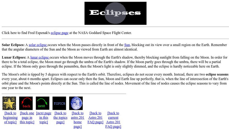 This site from the Astronomy Department of Cornell University provides brief introduction to both solar and lunar eclipses. Links are provided for pictures and charts of the eclipses, and this is a good site to check out on the subject.