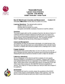 Student find the area of a sector of a circle. For this geometry lesson, high schoolers define the sector of a circle using a sketch. They find and identify examples of sector in the real world.