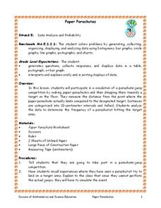 Students participate in a simulation of a parachute-jump competition by making paper parachutes and then dropping them towards a target on the floor. They measure the distance from the point where the paper parachute lands compared to...
