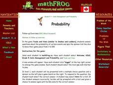 Fifth graders explore simple probability. Using a specified website, they play a "Fish Tank" game where they determine the chances of selecting a red fish from an aquarium. Students answer probability problems and convert fractions to...