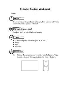 In this cylinder worksheet, students compare three different cylinders to experiment which one has the greatest volume. Students interact with rectangles as they experiment with the cylinders.