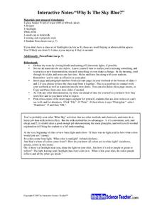 Students explore why the sky is blue. In this light lesson, students conduct an experiment using water, flashlights, and milk to test why the sky is blue. Students view a PowerPoint, take notes on their results and draw conclusions.