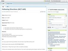 Students identify and descibe how to follow directions in detail. Then, they create and construct something requiring them to read directions. Students explain what they would do if they were driving to a particular place, but did not...