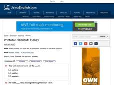 Work on money-related vocabulary with this practice worksheet. With words such as "auditors," "mortgage," and "bankrupt," the activity prompts ESL students to choose the correct term based on the context clues of the sentence. These ten...