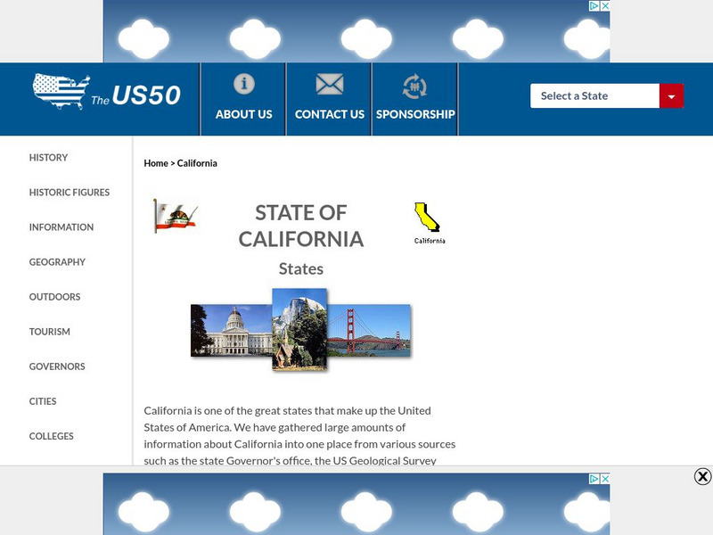 Provides excellent information regarding California's history, famous people, cities, geography, state parks, tourism, and historic sites. A fact sheet of information and a quiz are also available.