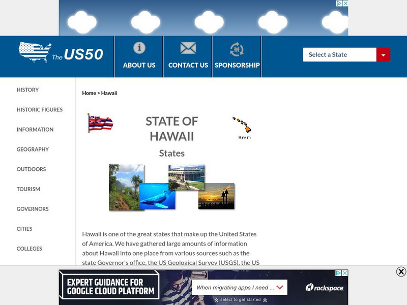 Presents extensive information regarding Hawaii's history, famous people, cities, geography, state parks, tourism and historic sites. A fact sheet of information and a quiz are also available.