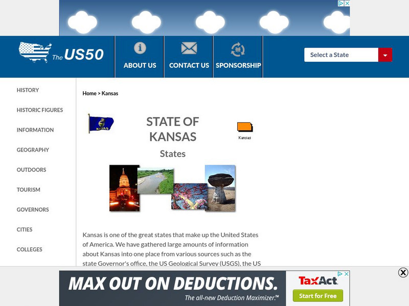 Features comprehensive information about Kansas history, famous people, cities, geography, state parks, tourism, and historic sites. A fact sheet of information and a quiz are also available.