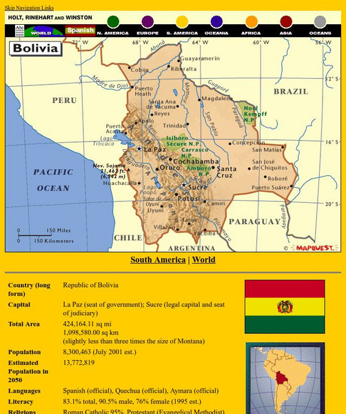 Find all the basic data on Bolivia on this page. Contains a clear map from "MapQuest", flag and facts in a list format. Categories include languages, religions, life expectancy, currency, GDP, industry, agriculture and more.