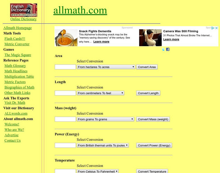 Conversion calculators galore! Convert just about anything from one measureable unit into another measureable unit here with over two dozen calculators. Each of the links is specific to a measureable quantity. Some examples include...