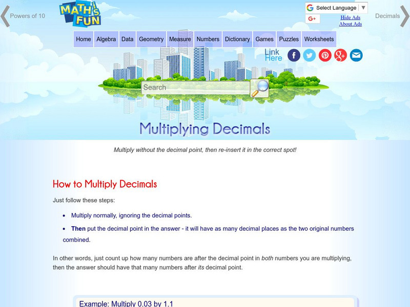 [Free Registration/Login may be required to access all resource tools.] For this learning module, students practice multiplying decimal numbers by powers of 10. Includes video demonstrating a sample problem [1:29] and a set of practice...