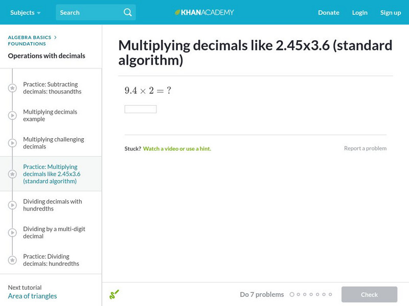 Practice multiplying two numbers that are written to the tenths, hundredths, or thousandths place. Students receive immediate feedback and have the opportunity to try questions repeatedly, watch a video or receive hints.