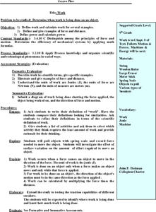 Ninth graders determine when work is being done on an object. They define work and calculate work for several examples. They define and give examples of force and distance and define power and calculate power. They determine the...