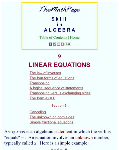Here is a site that clearly and thoroughly explains solving linear equations, from the basic form ax+b=c up through equations with variables on both sides and with parentheses. There are example problems solved, problems for the student...