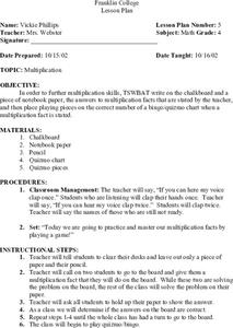 Fourth graders write down multiplication facts that are given orally by the teacher and then place playing pieces on the correct number of a bingo chart when a multiplication fact is stated. The winner is the one to fill a row...